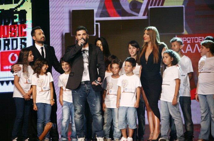 Παραλαμβάνοντας το βραβείο του από την Έλενα Παπαρίζου και τα παιδιά της χορωδίας των Παιδικών Χωριών SOS